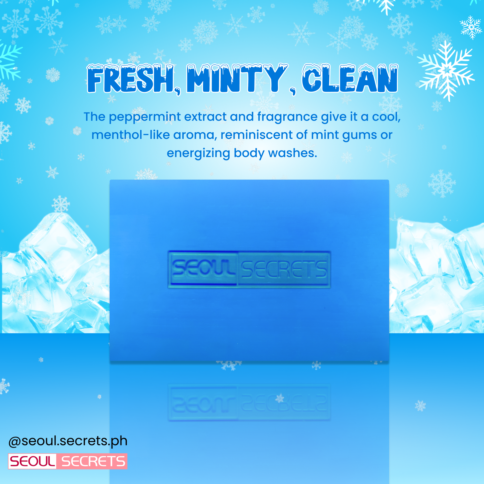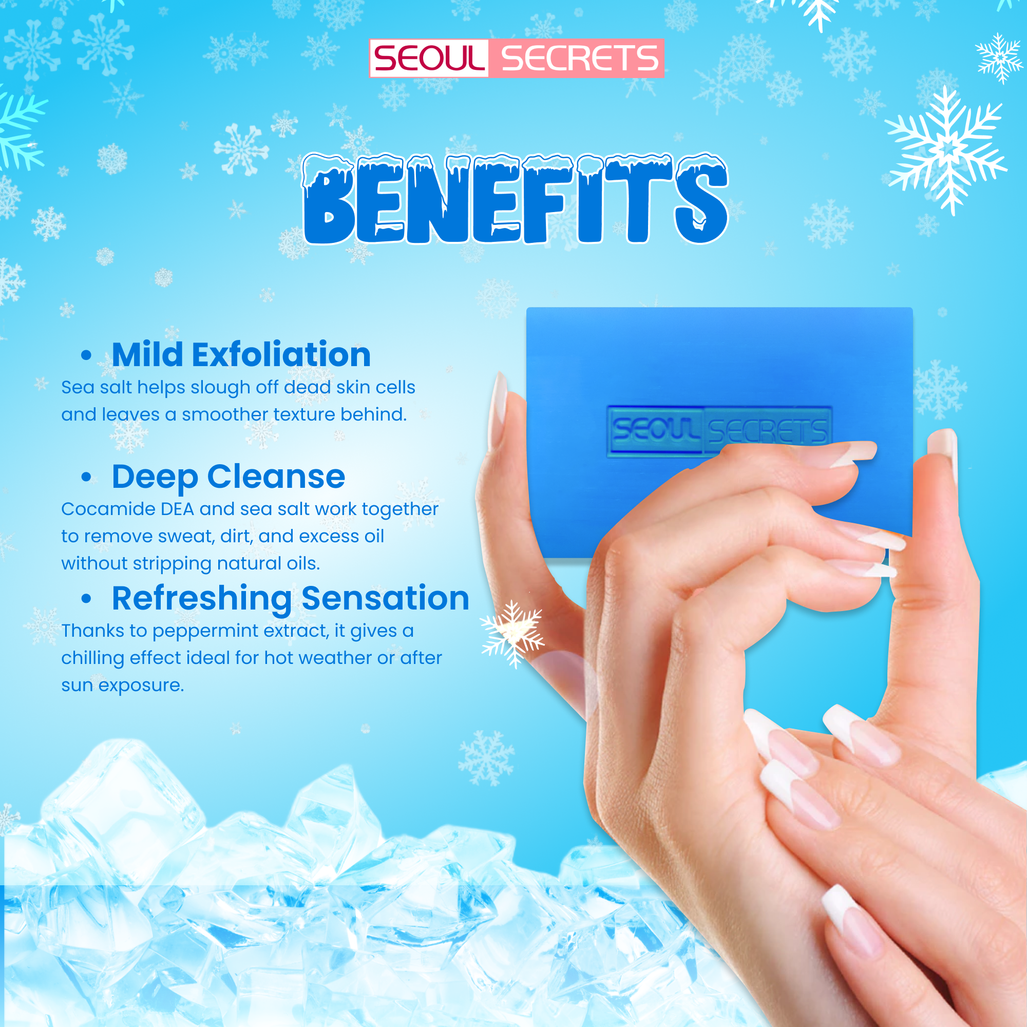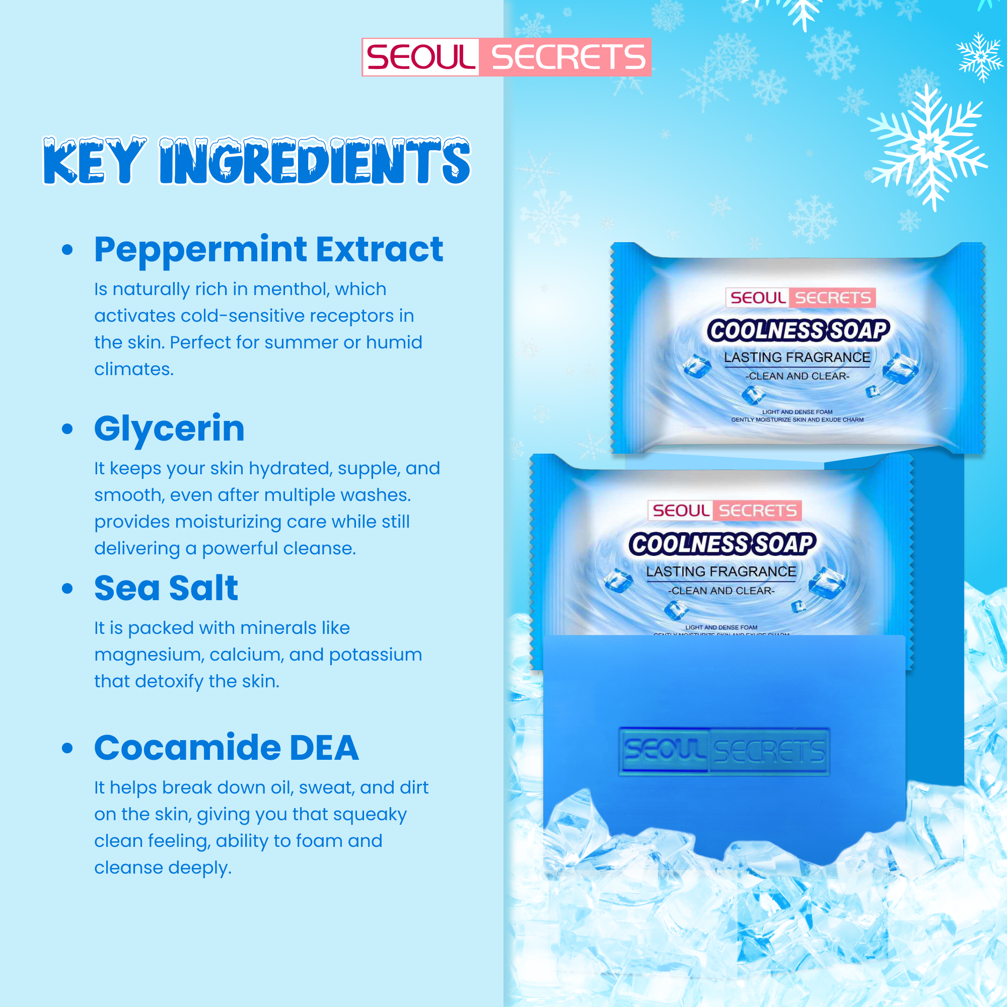 Description Seoul Secrets Coolness Soap is specially formulated to deliver a long-lasting cooling and refreshing cleansing experience. It effectively removes dirt, oil, and impurities while leaving the skin feeling revitalized and energized after every wash. With its cooling effect, it helps soothe the skin and provides a fresh, clean feeling that lasts throughout the day. Ideal for daily use, it helps maintain smooth, refreshed, and healthy-looking skin.